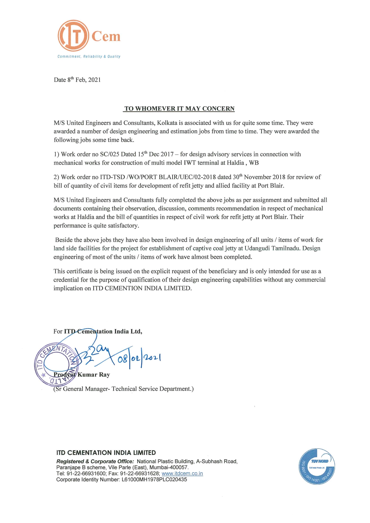 CONSTRUCTION OF MULTIMODAL IWT TERMINAL AT HALDIA, WEST BENGAL ADVISER-MECHANICAL ENGINEERING FOR THE PROJECT FOR REVIEW AND VERIFICATION OF DESIGN ENGINEERING PREPARED BY THE CONTRACTER